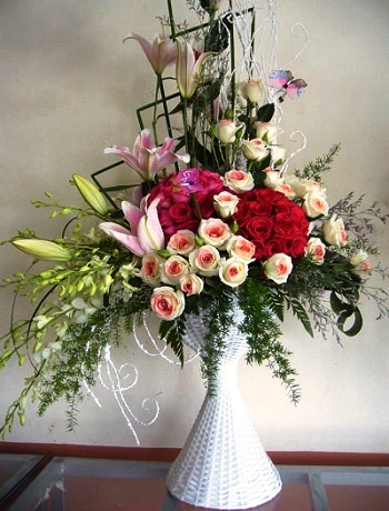 Kệ hoa 80cm. Phù hợp cho dịp chúc mừng các lễ kỉ niệm, khai trương.... Sản phẩm gồm: Hồng, ly, lan.... và phụ kiện kèm theo. Dịch vụ miễn phí thiệp, băn rôn đính kèm. Miễn phí giao trong nội thành